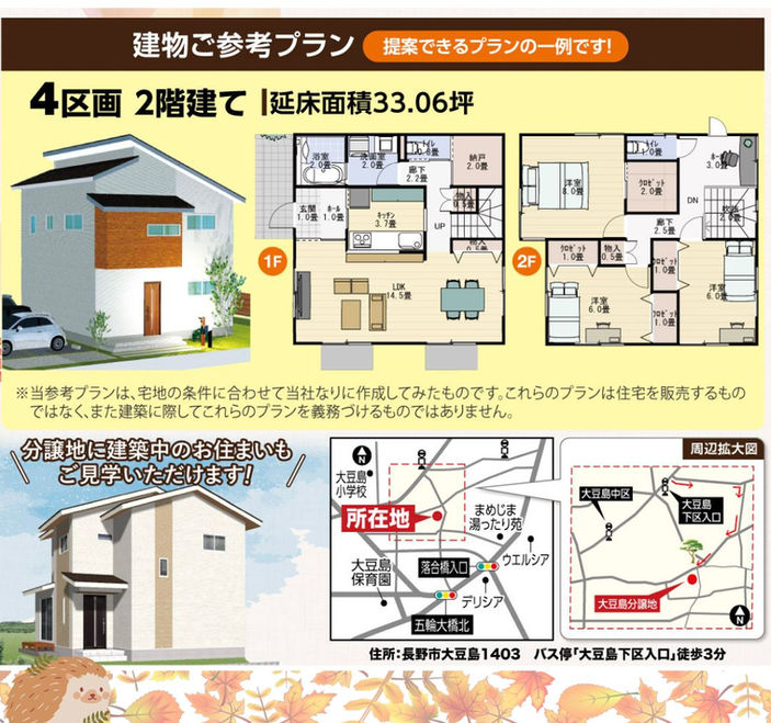 ・建物ご参考プラン:延床面積33坪、3台駐車可能